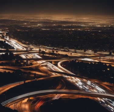 At night, Los Angeles from above is perhaps the most striking urban landscape on earth. Where London concentrates, LA expands. The city stretches impossibly far in all directions, a vast carpet of lights rolling from the ocean's edge to the distant mountains. If London's lights tell a story of history, LA's tell one of geography—following the contours of canyons, flowing through valleys, climbing hillsides only to stop abruptly at the wilderness boundaries.