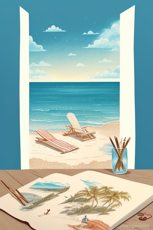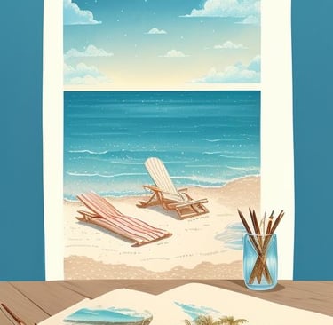 Years later, I find myself thinking about those childhood daydreams as I sit at my desk, staring at the illustration pinned above my workspace. It's a scene that could have been pulled directly from my youthful fantasies: an open window revealing a perfect beach day. Two empty loungers wait on golden sand. Beyond them, the ocean stretches to meet a sky dotted with gentle clouds. The entire image radiates tranquility, possibility, invitation.